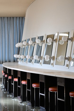 The main hall’s lobby is an atrium, and the blue ceiling, with pipes assembled three-dimensionally, evokes an image of the sky. The makeup tables in the dressing room of the main hall are uniquely arranged along the curve of the conical structure.
