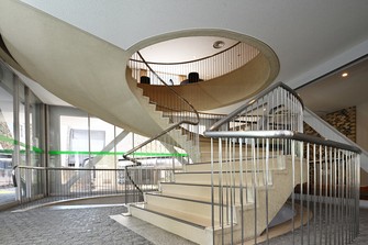 The spiral staircase connecting the basement to the second floor looks as if a space was cut out of the ceiling. Sakakura’s architectural aesthetics can be felt throughout, including the beautifully curved railing.
