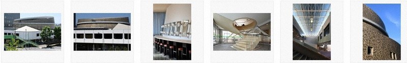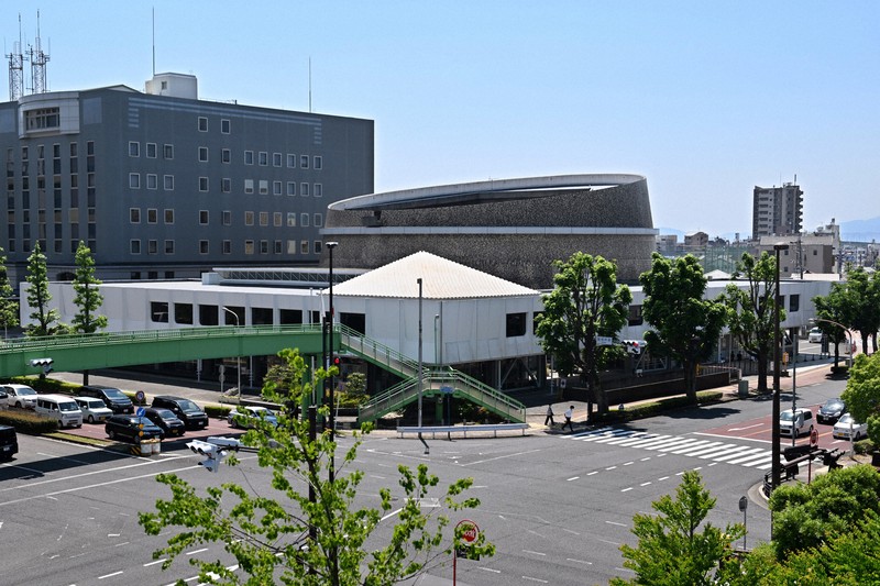 The Gifu Civic Auditorium’s design features the truncated cone-shaped main hall covered with tiles of various colors, flanked by rectangular structures on two sides in an “L” shape when seen from above. The reinforced concrete building with four floors above ground and one basement level was designed by architect Junzo Sakakura (1901-1969) and completed in 1967.